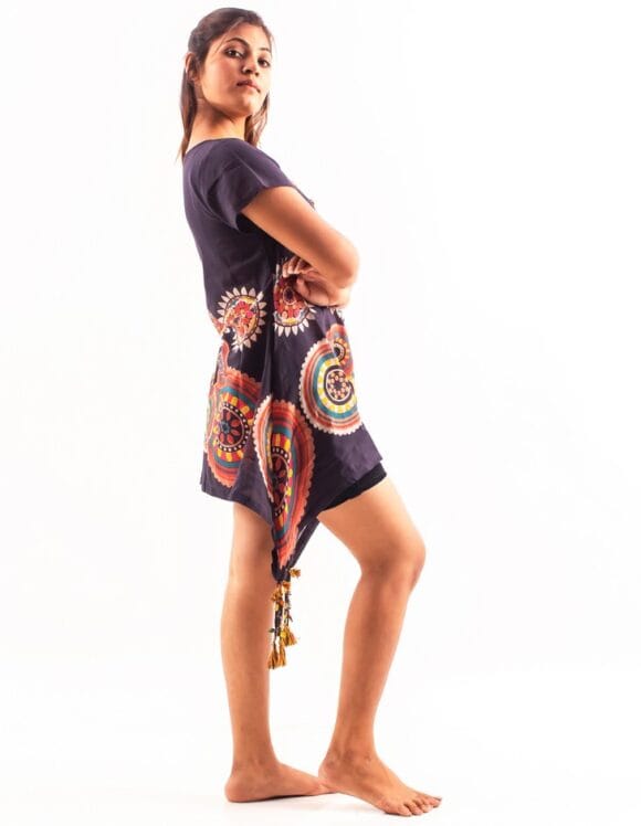 This Tushar Handworks psychidellic blouse is hand detailed by local artists with pom poms & colorful tassels making sure art & craft remains the most dominant part of Fashion!!. Good news is the print is available in 3 color combos to select from.
